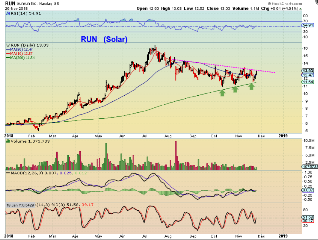 RUN – This solar stock also looks very choppy , but is bullishly set up and could break out. Again, it has been VERY CHOPPY. If you bought this in October, you have gone no where, but if it breaks out it may finally start trending higher. What a solid run it has in early 2018 when it started trending – $5 to $16.!