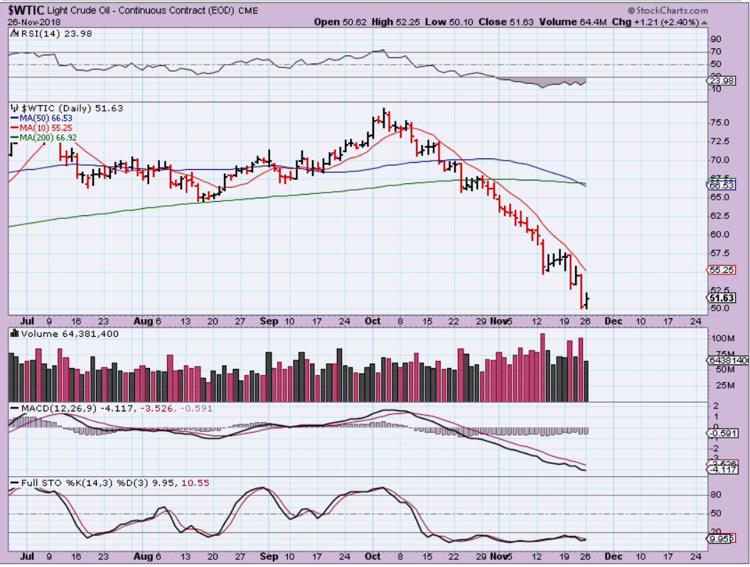 WTIC – Oil also has that bear cross of the 50 sma below the 200sma after that big sell off. Notice that not 1 of the bear market bounces curled the MACD upward at all. We do finally see a bit of divergence in the RSI on the last drop however.