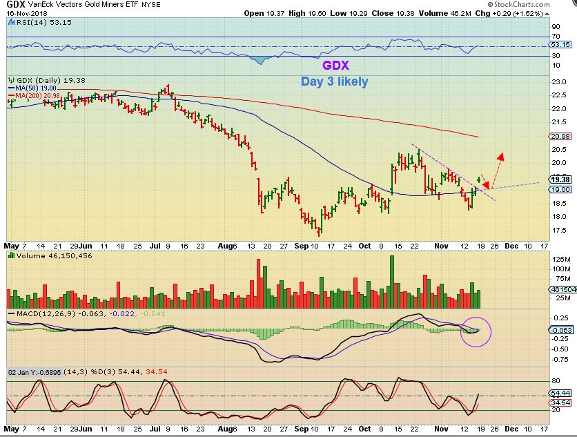 GDX DAILY – Just the facts: We gapped open Friday, so a drop as shown Monday won’t alarm me.