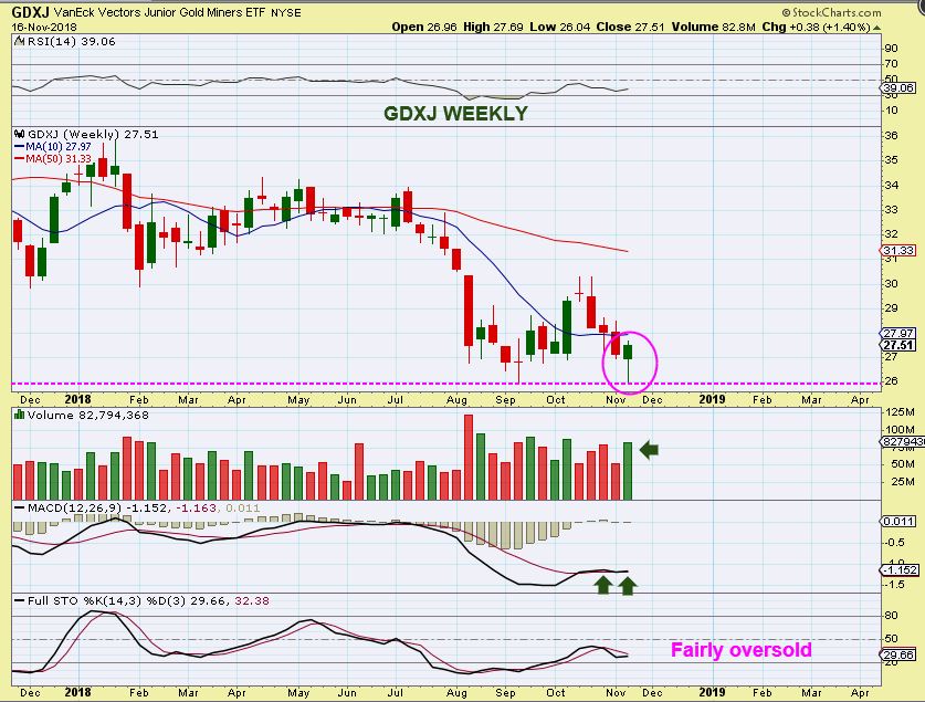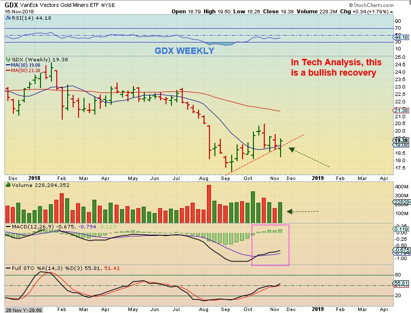 GDX WEEKLY – The weekly chart has a rather nice reversal candle. This pushed Miners back above the trend line and 10 weekly MA.  In technical analysis, buying that reversal made sense, and we stay alert as it moves forward from here. The chart itself looks really good.