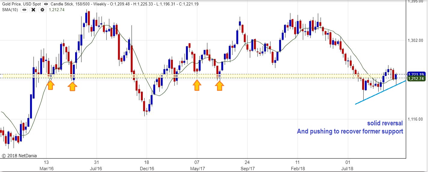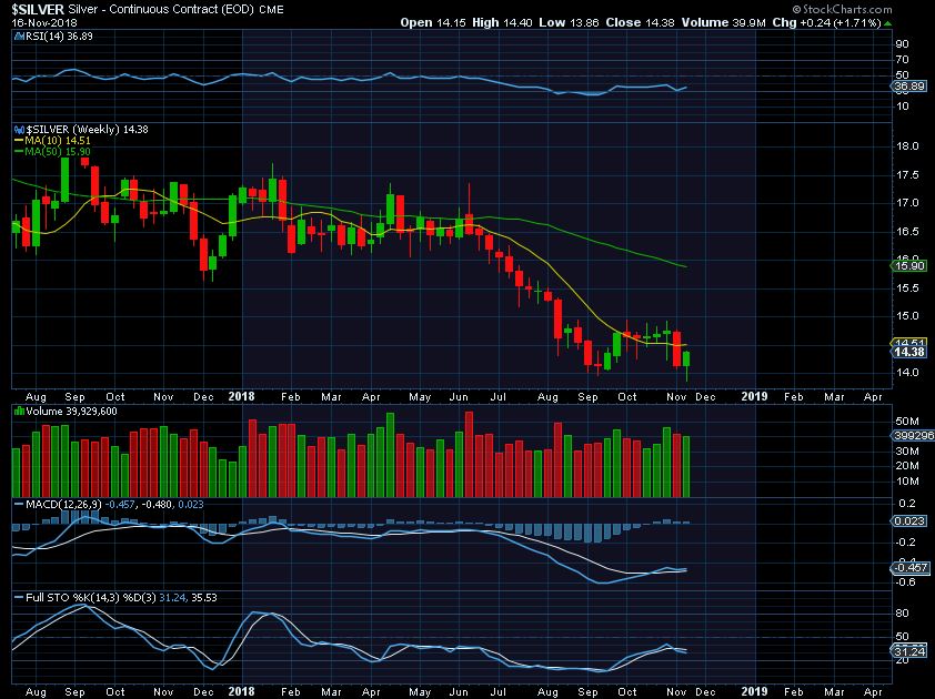 GOLD WEEKLY – The weekly chart actually has Gold closing above the 10 ma and pushing back through resistance  We have a weekly reversal higher off of the intermediate trend line.  This & the COT levels do make this look like a bullish chart at this point.