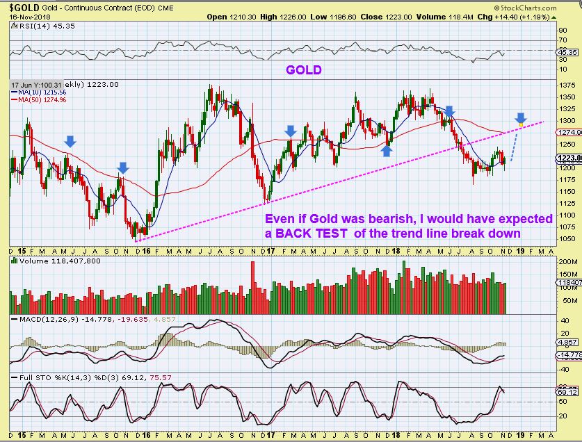 GOLD WEEKLY  – I would have expected a back test to the trend line anyway, so we’ll see if Gold can push at least that much higher from here.   Just a cautionary note here:   Using cycles, a 3rd daily cycle calls for caution, because it can form as a left translated daily cycle.  I am long Miners.