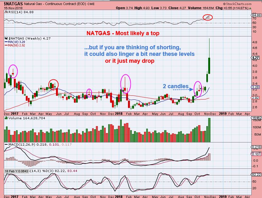 NATGAS WEEKLY  –  I see a topping candle on NATGAS in the recent parabolic type run. This usually ends with a drop from here, but in October, you can see that price went sideways too.