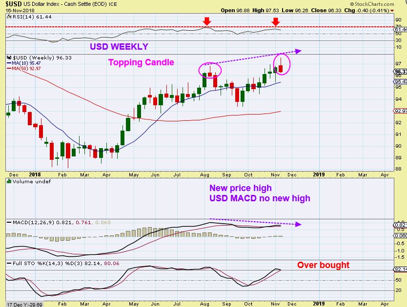 USD WEEKLY  – New highs with divergence and a topping candle. A drop should help Gold, which has started a new daily cycle.
