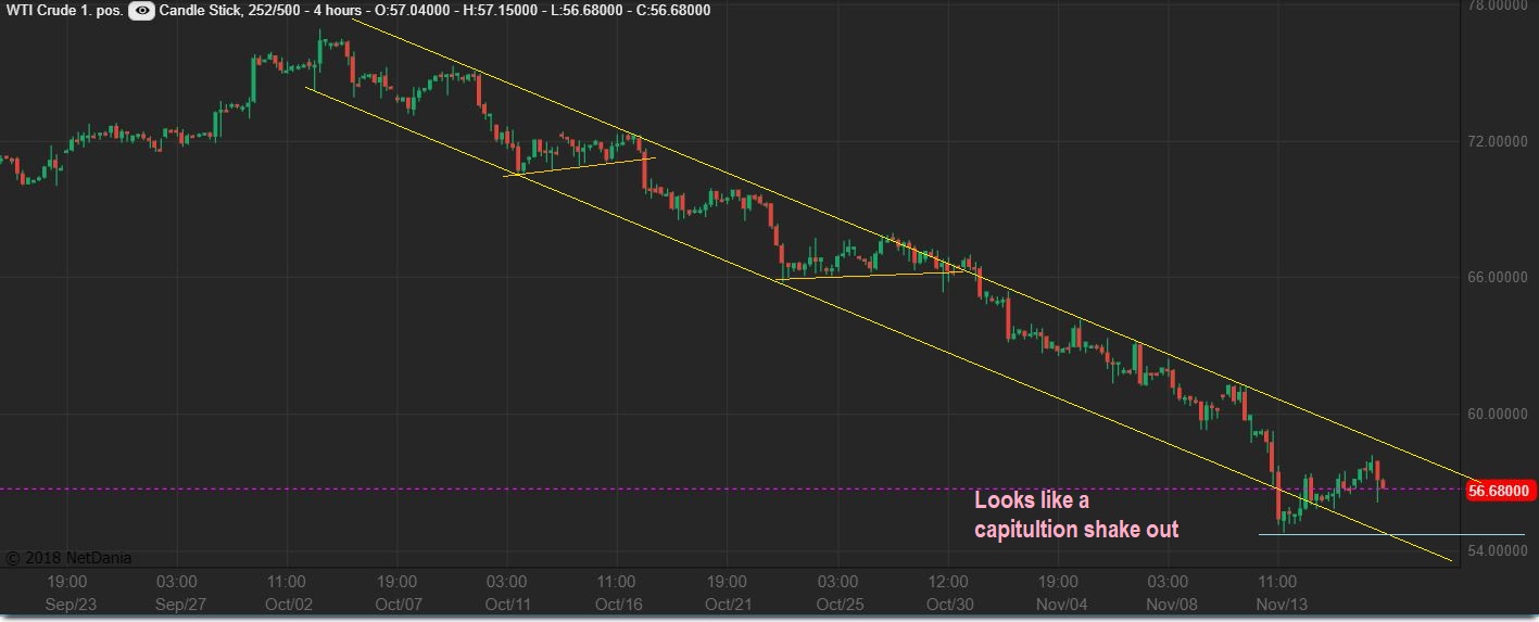 WTIC 4 HR CHART  – So I see a shake out at those capitulation lows, and I am hoping  that the lows do not need to be re-tested. I would love to see a break out from the down channel.   Let’s look at the Big Picture Weekly chart…