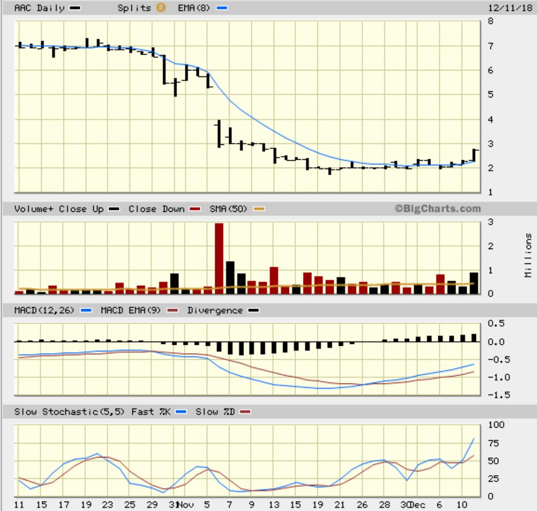 AAC  #2-  That doesn’t mean that it has gone bad.  This fell to the 8 ema on 1/2 of yesterdays volume, and I still like it. I am going to watch it Thursday, and maybe take a position.   It is risky,  but $2.50 to $6 looks pretty attainable if this runs to the gap.