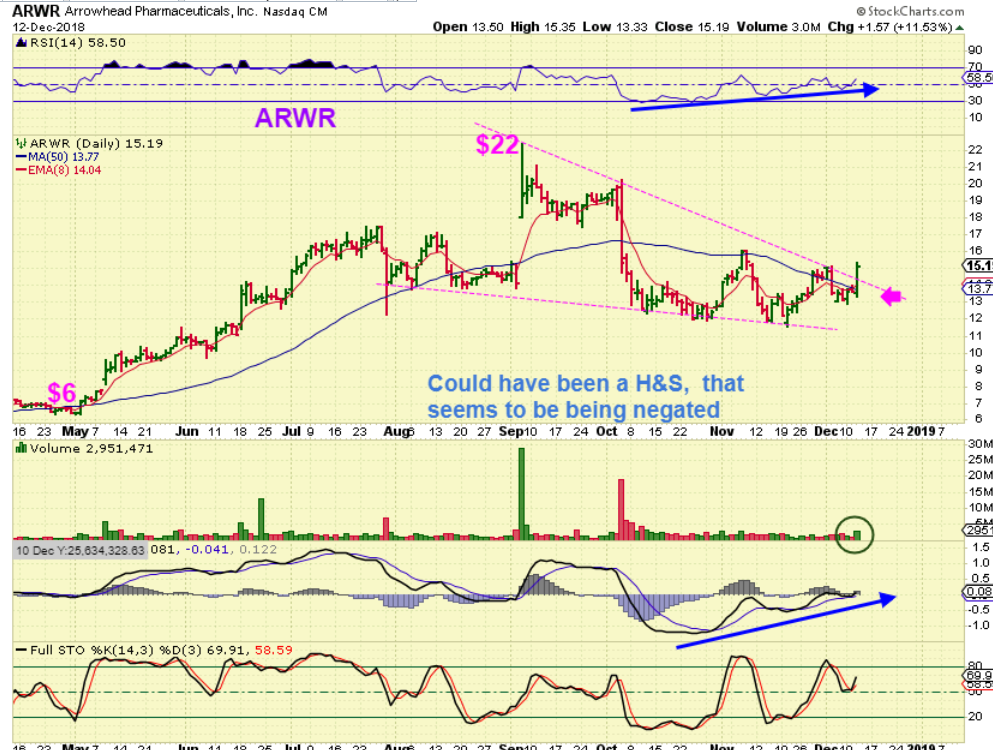 ARWR –  Pharma.  This is another Great Runner, $6 to $22 .   Yesterday it popped above the 50sma and  above the wedge.  Look how quickly this just ran from $11 ish to over $15 this month.    I almost bought this  pop today, but I have 10 positions and do not want more than that.