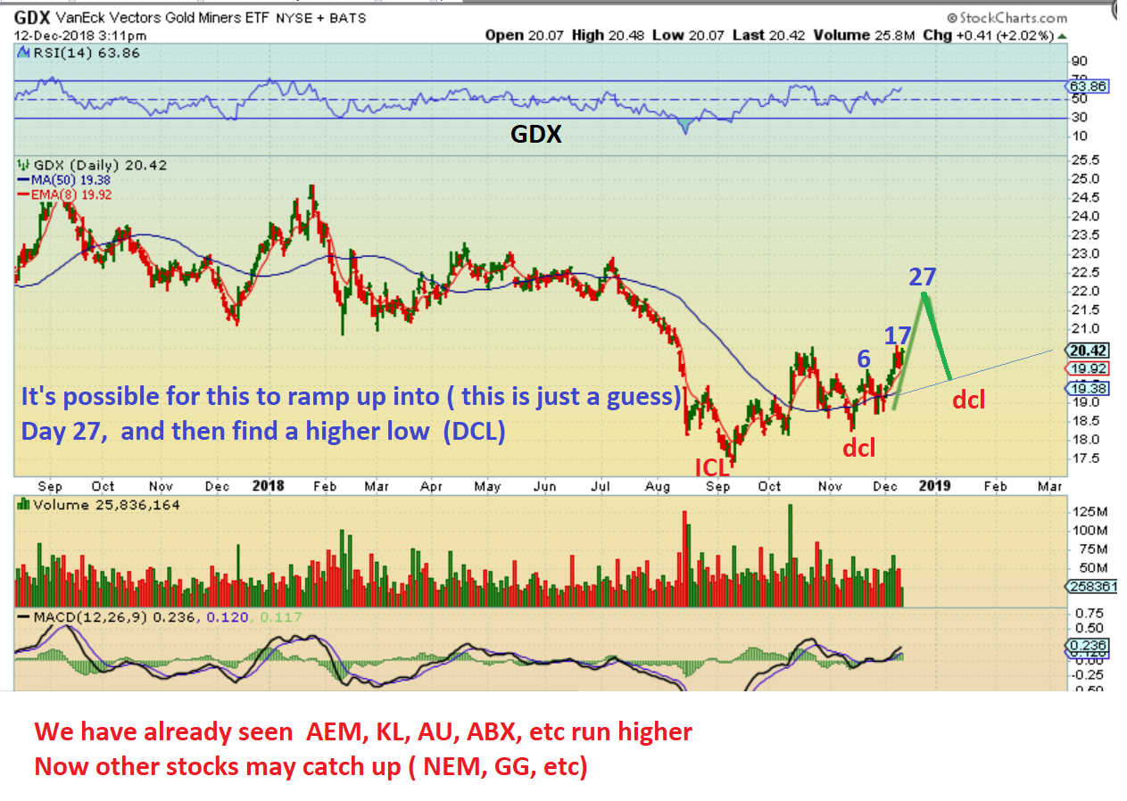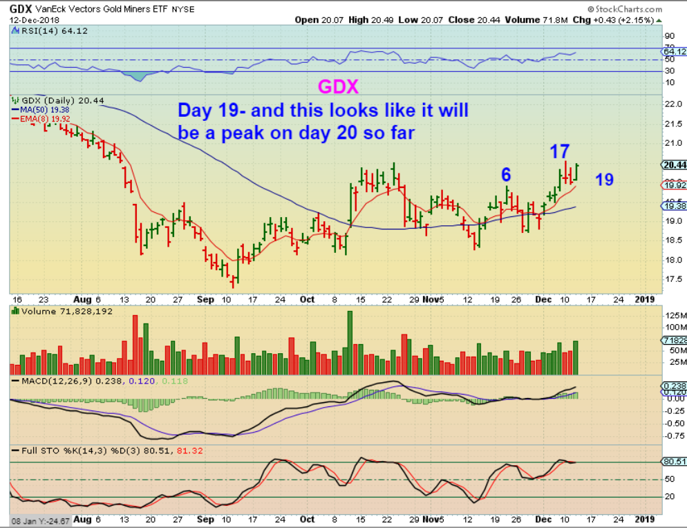 GDX #1 –  DAY 19.     This is actually a progressive base and since it bottomed in September ( not Aug like Gold), it may even run higher before dropping if Gold stalls at resistance, since some Daily cycles can run to a peak on day 22, 23, 25 or so.  I say this because Many Miners look more Bullish, and this is a series of Higher highs and higher lows.   Read the chart…
