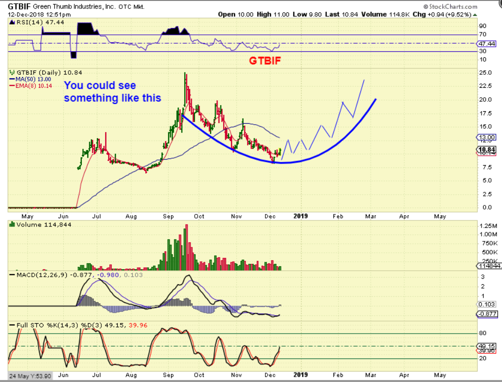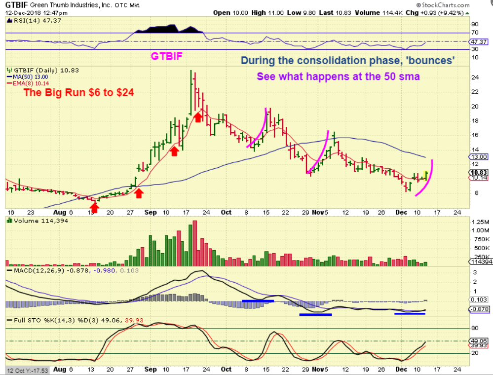 GTBIF #3  – With MJ stocks, at times we get the “RUSH TO GET IN” type move, as seen in August – September.  That makes a much steeper move higher, almost straight up.  So I take these a step at a time, and look for signs along the way.