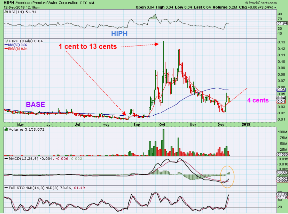 HIPH #2  – 1 cent to 13 cents, and a pull back .  Not everyone wants to trade penny stocks, but for those that do  ( keep positions reasonable), this COULD, MAYBE, MIGHT, POSSIBLY,   run back to the former highs.  If so,  that is 200% gains from 4 cents.  DO NOT put money in these that you can’t afford to lose,  these get choppy too.