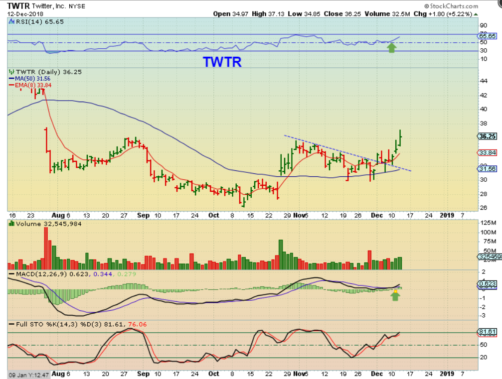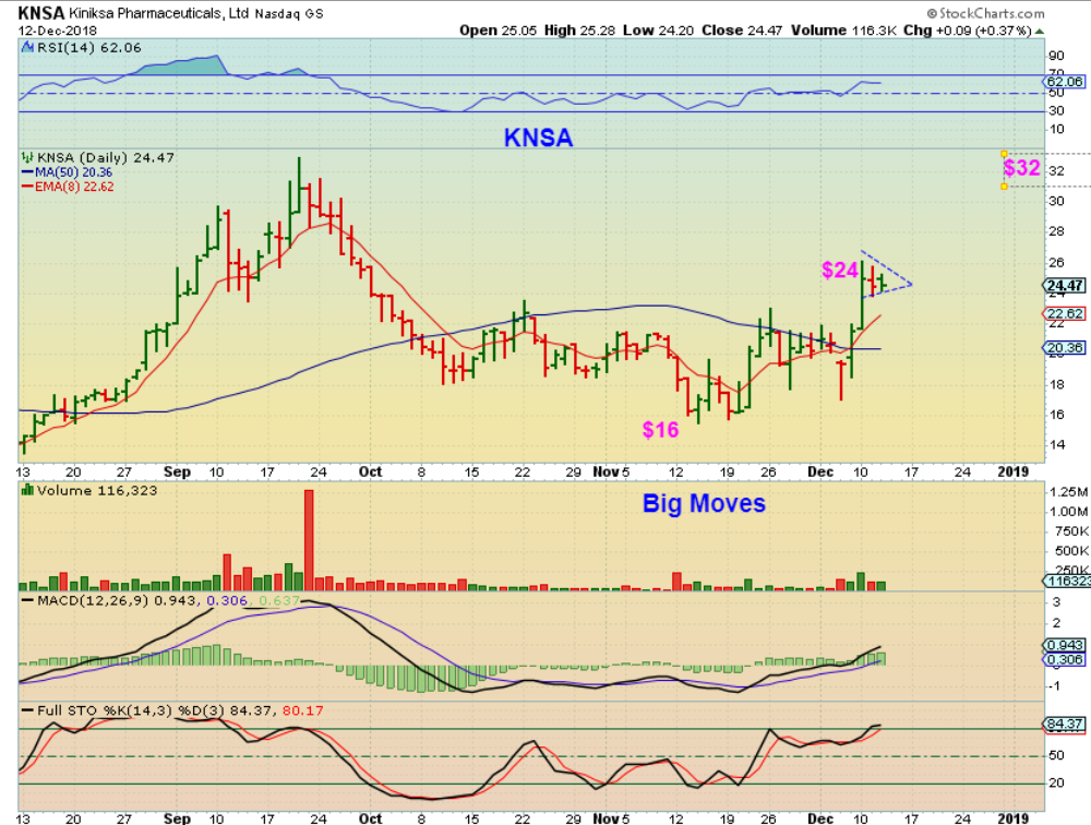 KNSA  – Some of these Pharma stocks are just crazy.  This had a solid run higher in August & September.   It dropped and  is forming a cup.  This has already moved from  $16 to $24 since the Nov lows.  This looks like a bull flag, and that can be a midpoint pause.  That would be another $8 upside to finish the cup.
