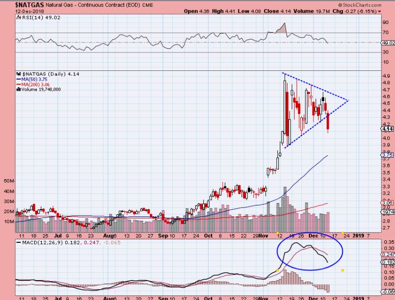 NATGAS –   This is a break down of that bull flag,   so this will probably drop to the 50sma, and it could even collapse and bounce its way down to the 200sma.  That would end the parabolic ramp ( I thought it had one more leg after the bull flag)..