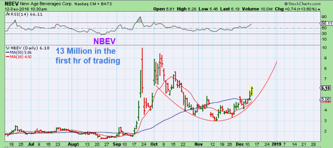 NDEV–  And I bought NDEV, and some have followed me in asking what my target is.  I expect a cup to form, if this sector remains bullish.  I pointed out WTER as an example and it exploded higher.   Feel free to lock in gains anywhere along the way,  or sell partial positions, but at this point,  I bought it and added so far.