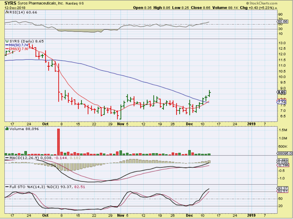 SYRS – I posted this as a Biotech BUY breaking above the 50sma, and it is still moving higher nicely.   I think that it can run to former highs, so I buy & hold these.