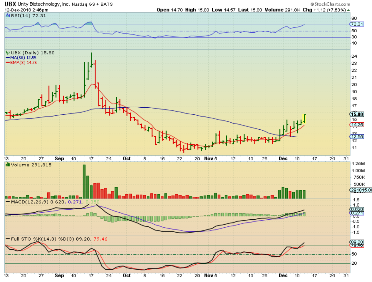UBX – I bought this in the  $13 area as it crossed the 50 sma.  It  is a slow and steady winner, hitting $15.80 .  That volume makes this look like it could accelerate too.  If it pulls back to the 10sma ,  it could be bought.