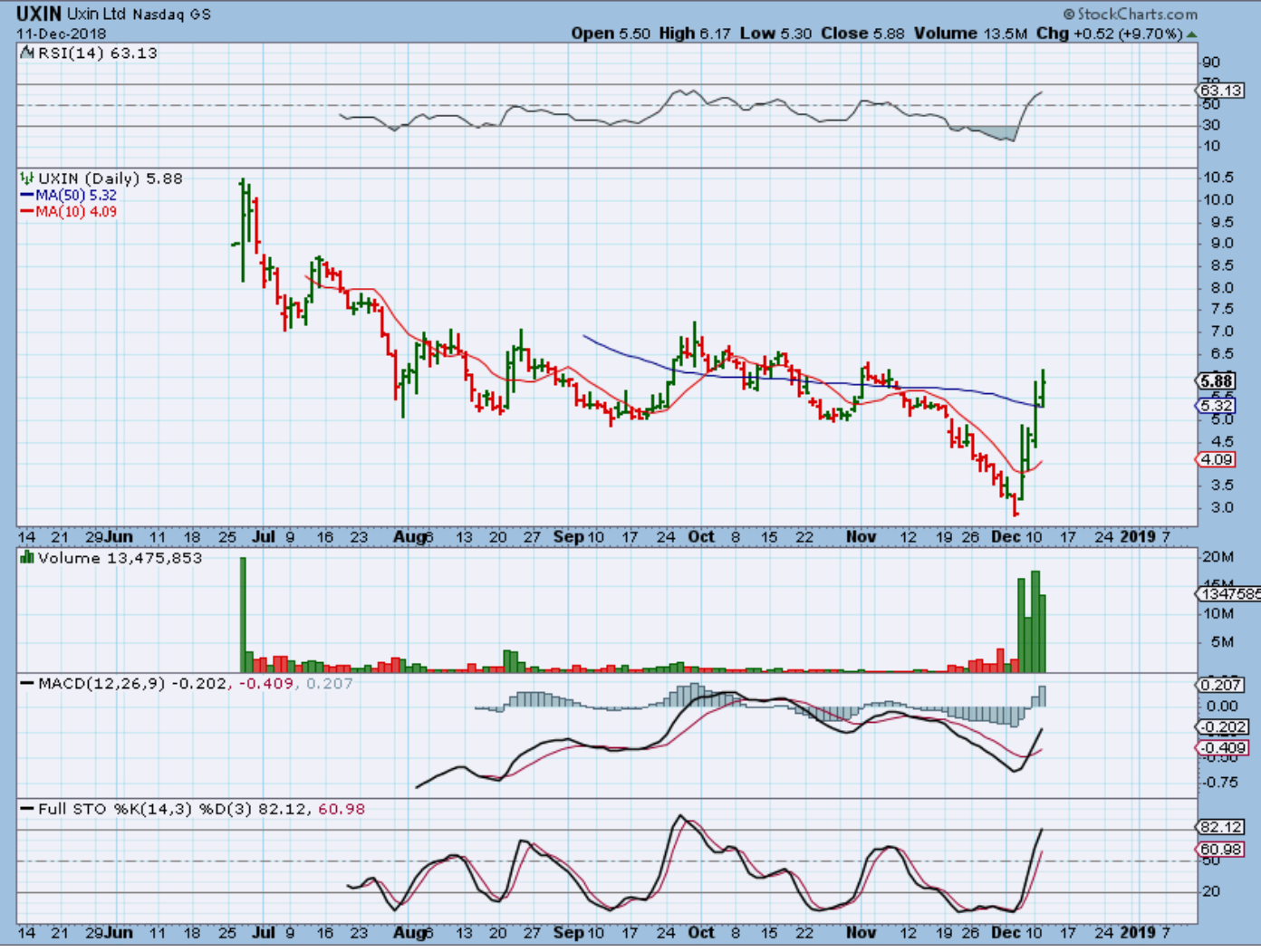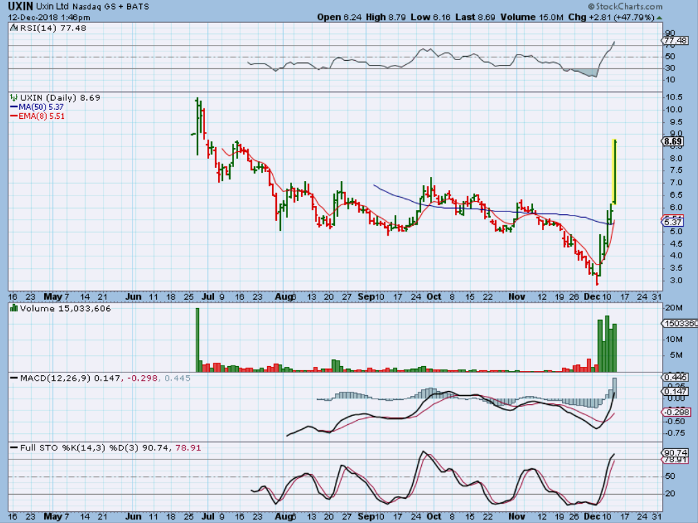 UXIN – WHOA!   Make that $3 to $9 in 5 days.   I missed this one,  maybe I will buy the pull back.