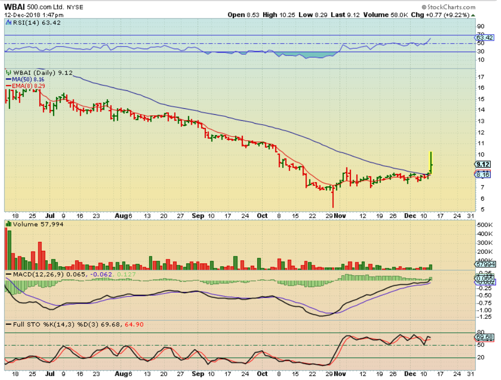 WBAI – BOOM!   This was $8.25 to $10.25 , but then sold off a bit.  I would still hold it, this can run in my opinion.  If it slowly backtests that 50sma, That is a BUY again.