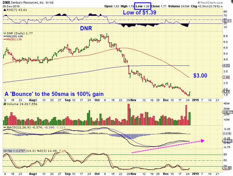 DNR – When I mentioned these Energy Stocks in the comments, they were up 5%, DNR closed up 24%. So even a small short covering bounce to the 50sma is a 100% gain. They do need stops though.