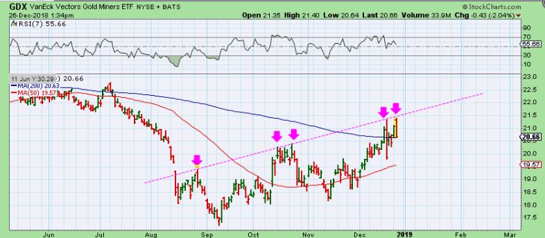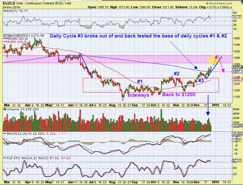 3. Daily cycle $3 then broke out and back tested that base. That is often BULLISH – a break from a base is one of my favorite ‘long’ trades, but 3rd daily cycles are often weaker, so I only traded a few Miners at that time. Now Gold could be ready to make a nice move higher after the next dip. The 3rd daily cycle low COULD BECOME an ICL back test.