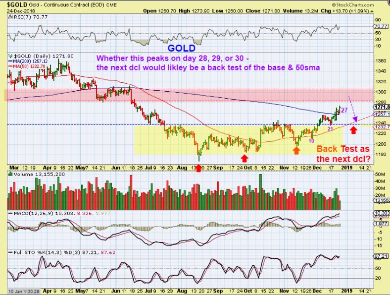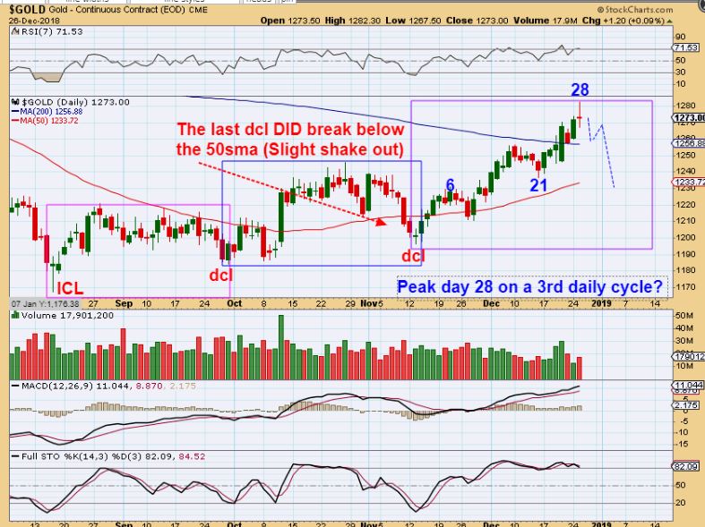 GOLD DEC 26 – Gold ran strongly in pre-market, but sold off as the day went on after tagging resistance. A day 28 peak so far is quite strong and is pretty bullish. I expect a drop, but Gold can tag that $1280 area again too.