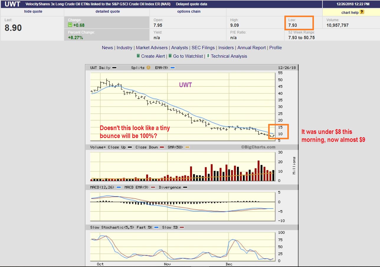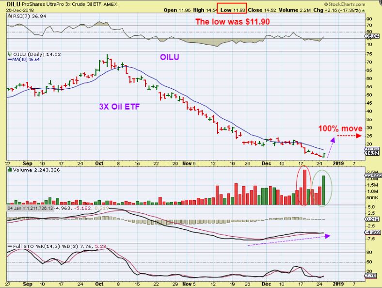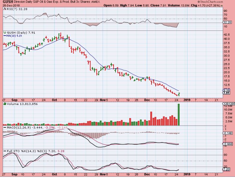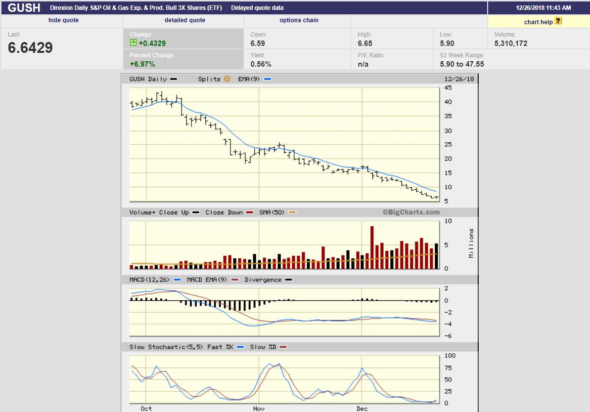 Do you recall that I Bought A GUSH reversal in October near $19? I sold later, but what if I just wanted to ride this dip out? What if I said, ” I expect lows in Oil soon enough, so I’ll just hang on. ” ? Well, Gush dropped from that $19 to $6 in a month. PLEASE DO NOT PLAY 3x ETFs if you ride your losses down. Stops MUST be used on leverage.