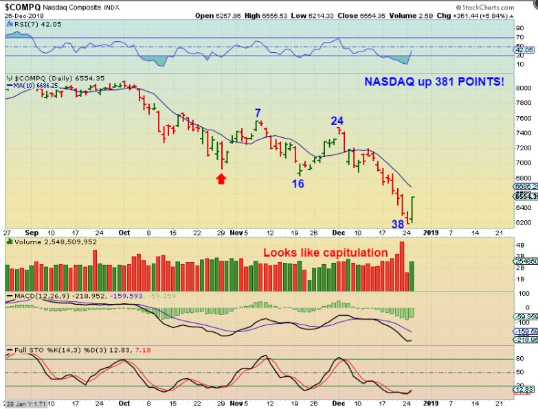 The NASDAQ was up 381 Points – That is a swing low and we did see capitulation type panic wash out selling. On day 38, that is almost surely the ICL.