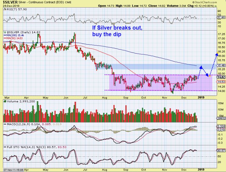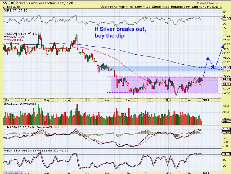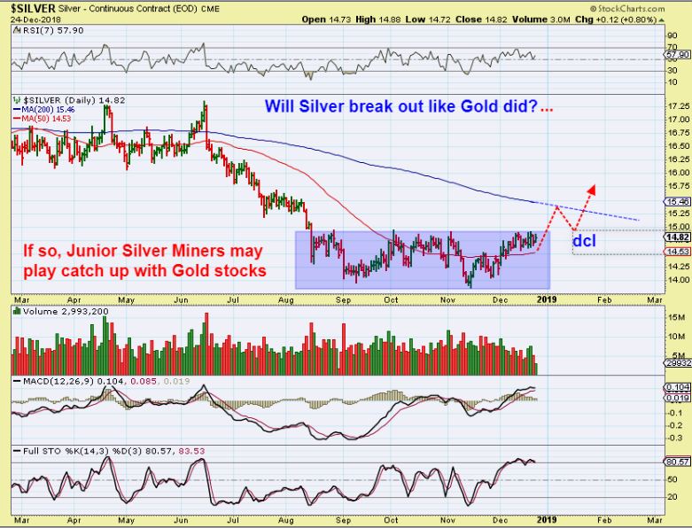 SILVER – A stronger break out? At times we see Silver & Miners lead Gold. I noticed a new low in November for Silver, so it is possible that Silver lows are in, and it may break out, even as Gold pulls back. Silver stocks may then resist the dip into a dcl by Gold too. ( This is just a guess based on the set up at this point. It could drop to the lows of the base too, but I am always thinking ahead and prepare for anything / surprises that we might see).