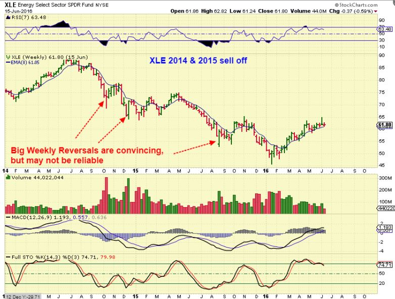 WTIC – Oil dropped to the $42 area Wednesday and put in a solid reversal candle. As it started to reverse, I always look to see if the Oil / Energy stocks are also turning up, and lately they have not followed Oil bounces recently. THIS TIME THEY DID, Oil stocks were following OIL reversal & The General Markets reversal higher, so I want to look closer.