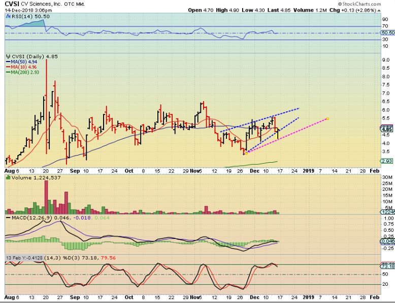 CVSI – CVSI had a wedge form and I drew that in.  This would call for a break of the lower wedge trend line. So far it held up at support though.