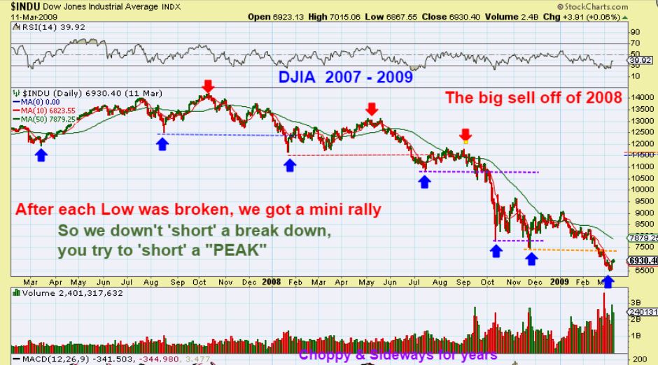 With the Jan  2008 break down to new lower lows, the markets almost immediately popped ( DCL) and did not sell off for the ‘shorts’.  Then the break down in July 2008 to lower lows also bounced & went sideways for weeks too    The RED ARROW is the daily cycle high, and when a downtrend develops,  that is the best time to short a market,  but it still wasn’t easy.  These bounces lasted for weeks and it can be hard to find the actual ‘peak’ too, but shorting a few weeks after the DCL MIGHT BE better than shorting a break down