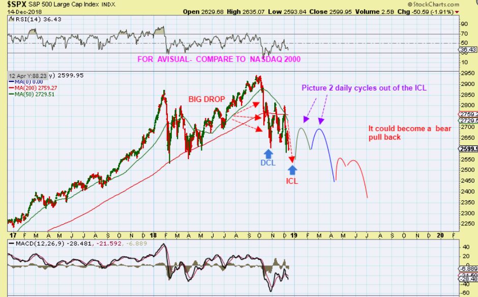 SPX  NOVEMBER 16 –  With our daily cycle move out of the lows in October, this chart pointed out that if the lows of October were broken,  the ICL could be lower in an A-B-C move.