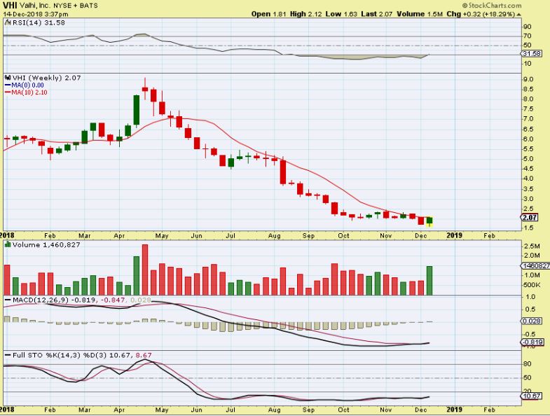VHI WEEKLY  –  This is the weekly chart .  It dropped from $9 to about $1.50 & now has a high volume weekly reversal in place.