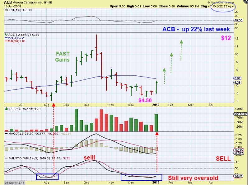 ACB WEEKLY –   Do you see great potential, if it only does what it did last August to October?  NOTE: This remains VERY OVERSOLD On a weekly basis. In August, it stalled at the weekly 50, but it also dint have THAT volume.