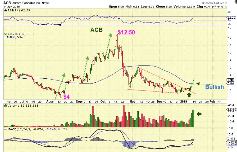 ACB DAILY –  We grabbed this days ago, and it gained  about 10% avg daily.  It easily broke the 50sma with increasing volume, these look very bullish.  The Weekly chart follows.