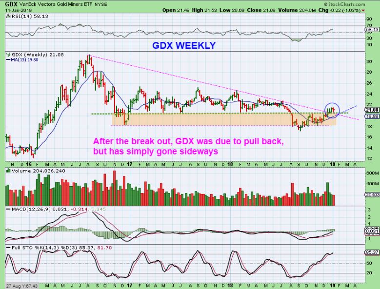 GDX WEEKLY –  As mentioned,  this is a recovery, and they usually do not break down again, so it has been going sideways for weeks.