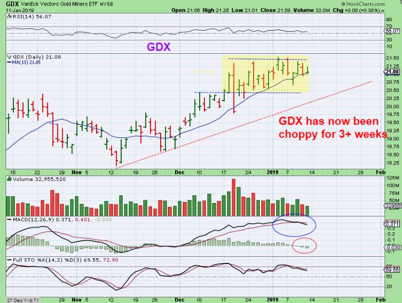 GDX DAILY – This is actually now  3 weeks of choppiness as it consolidates the recent gains.  We now have a MACD cross down and this can drop further from overbought.  So far, each dip to the 10sma has been bought.  When that is broken, I’d say we’ll get our DCL.