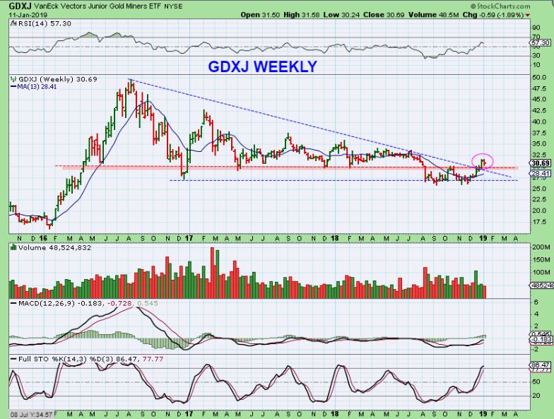 GDXJ WEEKLY – This is also  a break back into the Bullish Zone.