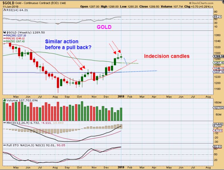 GOLD WEEKLY – A pullback is due, but Gold wont sell off.  These are 2 weeks of indecision, so we may see a pull back next week.