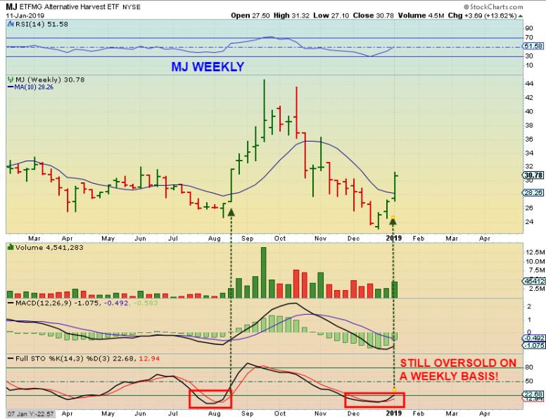 MJ WEEKLY – I’ve been pointing out this Sector as it moved off of the lows & broke the down trend line, so why not cover it Big Picture too?   With STRONG follow though, the weekly charts look EXCELLENT.  Notice that This is still oversold!   This ETF gained another 13+% last week.  This trades on the NYSE.