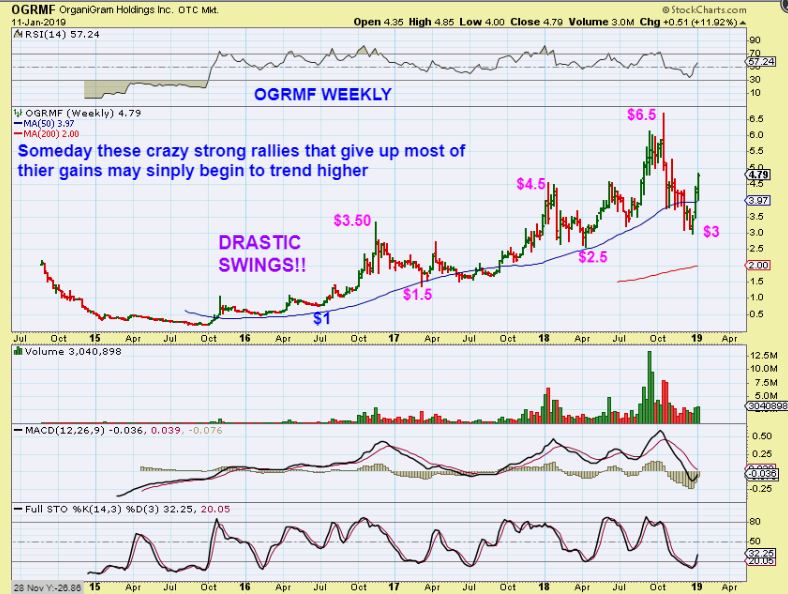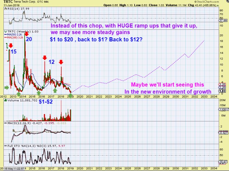 My thinking is that with the legalization taking place for Medical and recreational use of Hemp and Marijuana,  the growth potential in this sector can  start money flowing in for the BUY & HOLD crowd too.If they buy and stay invested-   These large Bursts higher that have dropped a lot in the past may just start trending uphill  in a tighter manner. This is still up trending, it is just hard to hold these big swings. See the chart and …