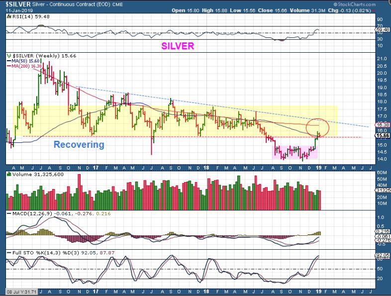 SILVER  WEEKLY –  The weekly Silver finally broke out after leaving that small base behind.  Since this is a ‘recovery’ similar to GDX GDXJ, they usually do not fail again.  That means that Silver may just continue sideways.  Let’s look at the daily for possible clues…