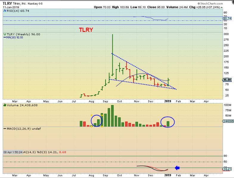 TLRY WEEKLY – Trades on the NASDAQ, This weekly chart has Massive potential if this gets going again.  It was up almost 30% last week. This can run a lot higher.