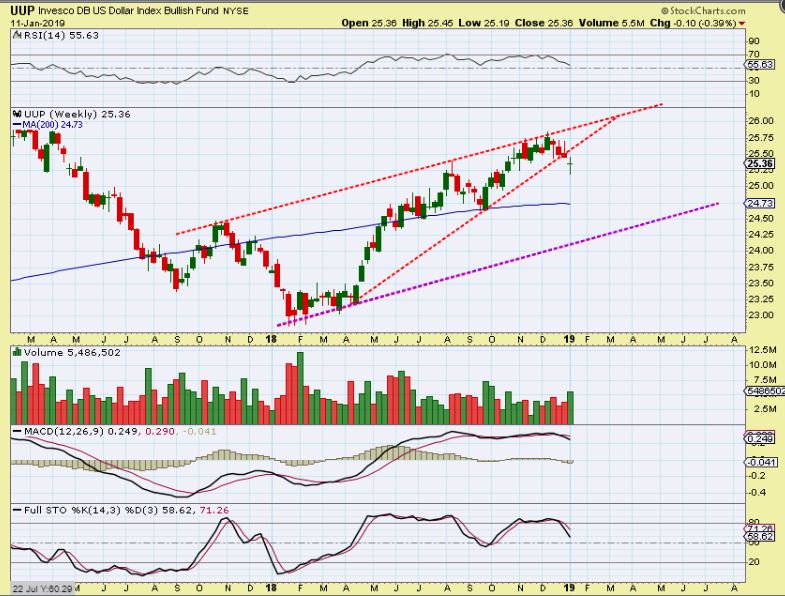 UUP  WEEKLY – I even see a rising wedge.   Is that a USD reversal?  If so,  the USD can back test the wedge, GOLD, SILVER, & The Miners  can pull back a bit more.