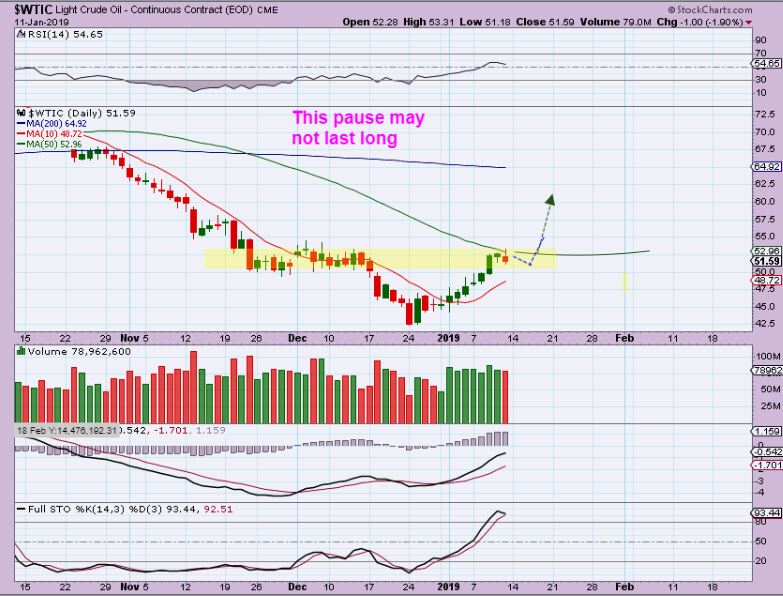WTIC DAILY #1- Oil has paused at resistance as expected too, but this looks bullish and it might just break higher soon.  The sideways move on the left did last for 3 weeks though, so this one can linger too. We may need patience with Oil, but if it Breaks above the 50sma,  you may want to add to positions and raise stops, with a tighter stop under that 50sma.