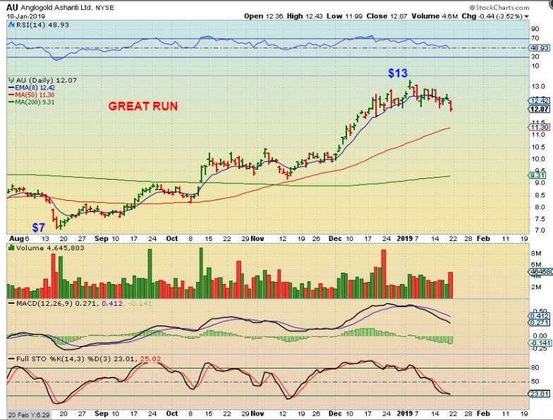 AU #1 –  What a great run, almost 100 % off of the August lows.  Notice that each pull back has been really mild, in fact, it  has been pretty much just sideways chop to support of the 50sma  in October & November.  Is that where AU will go now?