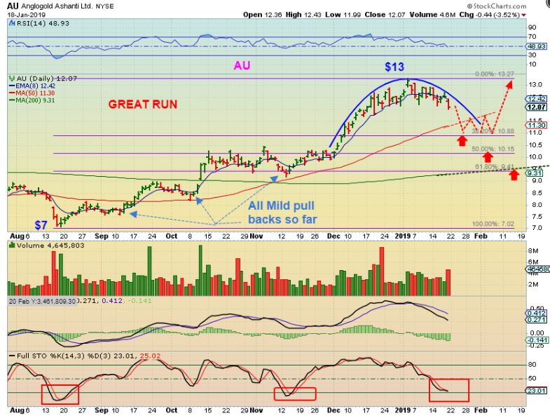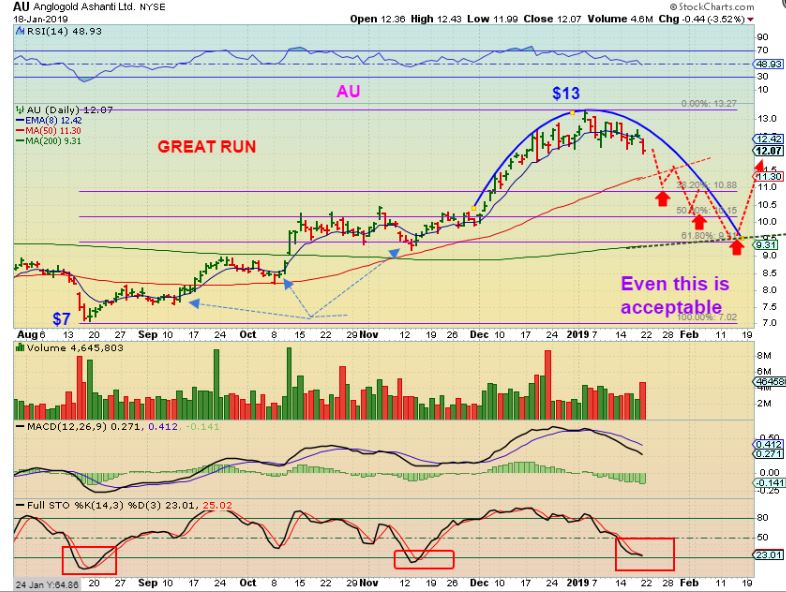 AU #3 – I would guess that the timing for the GOLD ICL will affect the depth of the sell off here.  For example:  If the drop for GOLD is sharp & quick, an ICL could form quickly as AU tags the 38% or 50% higher area, but if the selling is dragged out and it takes a month to get to an ICL for Gold?   Then I could see the AU Price sell down to the 61% area / 200 sma as shown.