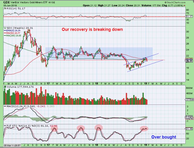 GDX WEEKLY – We recovered from the break down for a couple of weeks and I really wanted to see that recovery hold up.  GDX rolled over this week and closed under the weekly moving averages. That is a weekly swing high, and take a look at the weekly stochastics .