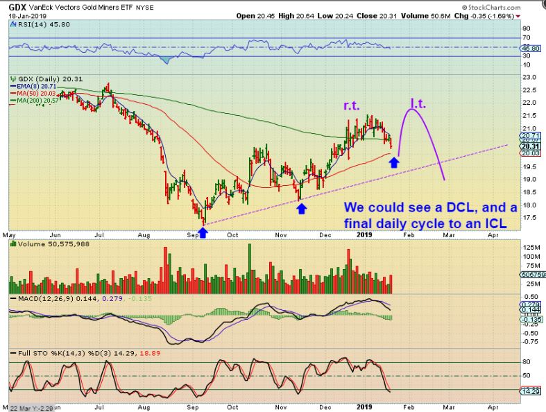 GDX FORMS  DAILY CYCLE LOW SOON , THEN BOUNCES into a Left Translated Peak for the final  Daily Cycle,  and a final drop into Feb for an ICL.