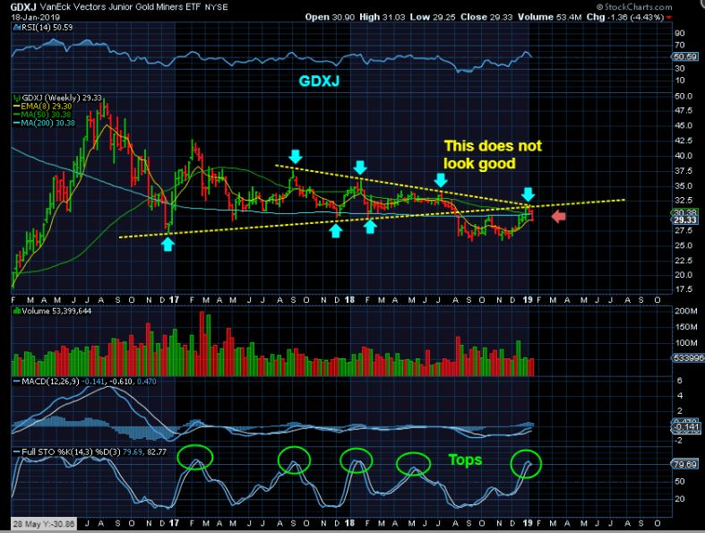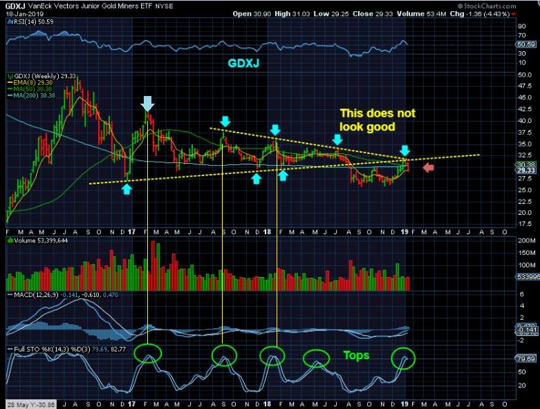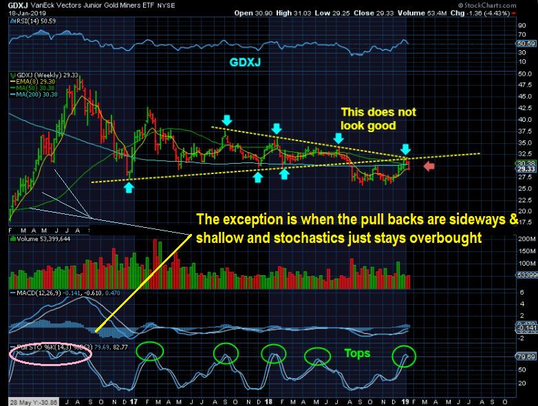 GDXJ  WEEKLY #2 of 3 –   Look at the stochastics and the alignment of prior tops. In the past, what I see here leads to multi week drops.  I WILL NOT BUY THE DIP until we see a sign of strength / reversal.