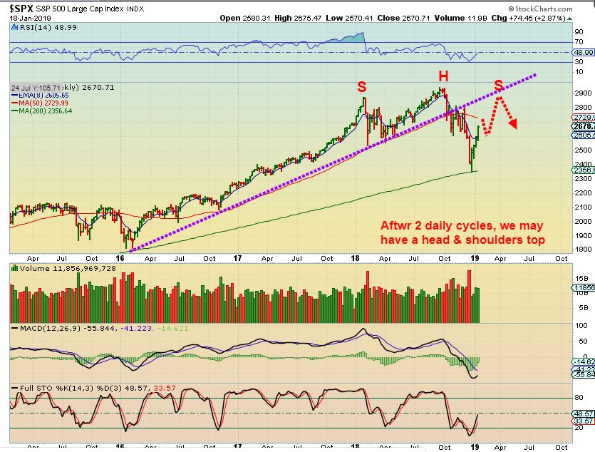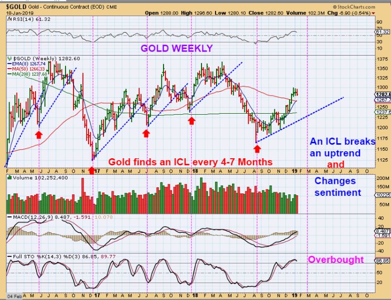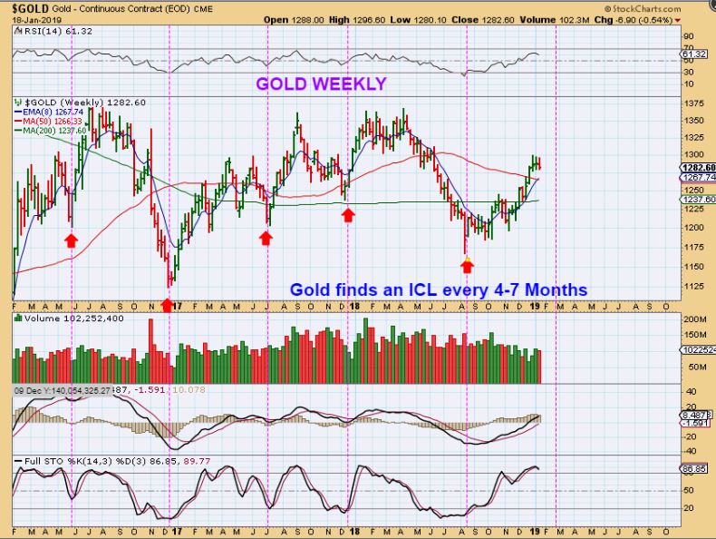 GOLD WEEKLY  #1–  ICLs come due USUALLY  5 or 6 months apart, but we have also seen them at 4 & 7 months. Let’s just say “Roughly every 6 months or 1/2 year to make it easy.  The last one for Gold was August, which is 5 months ago. Gold could drop into the 6th month.